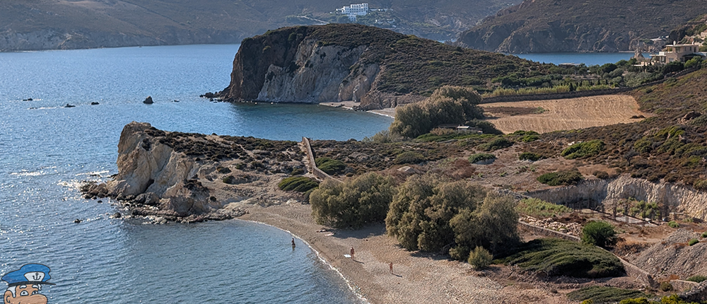The second Beach, further West beach beyond the first Didimes beach is either accessed by walking over the small headland or by a footpath from the road around a field. Again, there is no vehicle access, even though Google maps indicate a track to the beach. The beach itself is similar to the first with stones and sand and Tamarack trees. Both beaches provide good opportunities to sunbathe naked.
