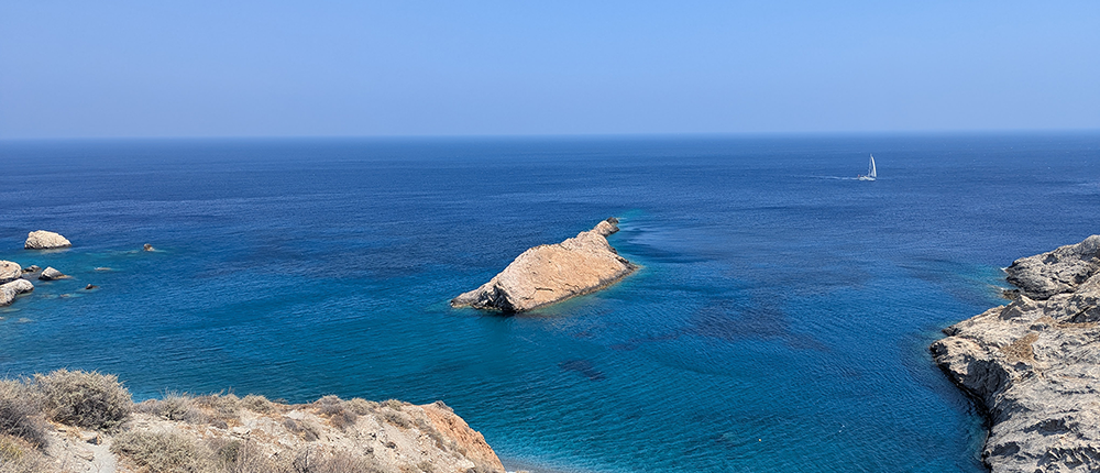 2019 June: Probably the best beach we visited. Came on the 11.15am boat from the port at Karavostasis (€10 return) and stayed all day. The beach is coarse sand and small pebbles and shelves steeply. The water is clear and the new rocks make great snorkelling. It just catches the meltemi so it can be a little windy and the water choppy if its high as it was when we were there, but it didn’t take the edge off the day. About 20 people on the beach, about 30% naked but no issues. No facilities and precious little shade until after 3pm when the sun starts to go off the beach, so take everything you need. A really lovely day.