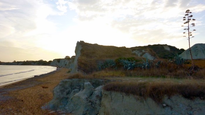 To access Mania beach, head towards the Ionian Sea Hotel, not towards Xi, take a left ¼mile (0.4km) before you reach the hotel. You arrive at a small parking area on the cliff above the beach. Walk to the left to go closer to the point that divides Koutala and Mania, this end is naturist. Be aware there are often rock-falls from the cliff behind so be careful.